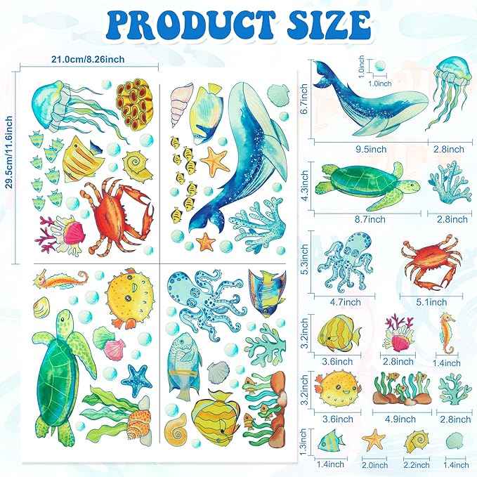 - 【Premium Quality】Our sea ocean decals are made of high quality vinyl and pvc material, safe and non-toxic, removable,durable and waterproof.the sea animals'color are bright and long- lasting, not easy to fade.