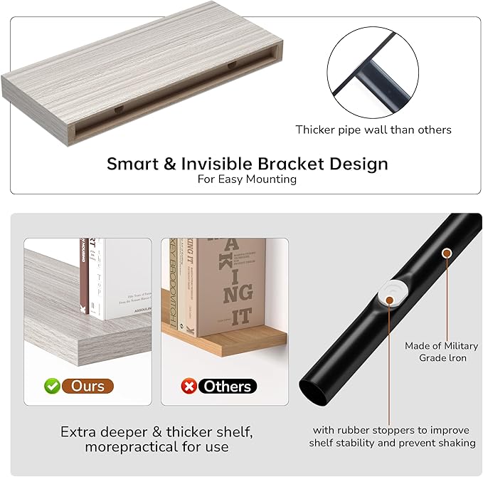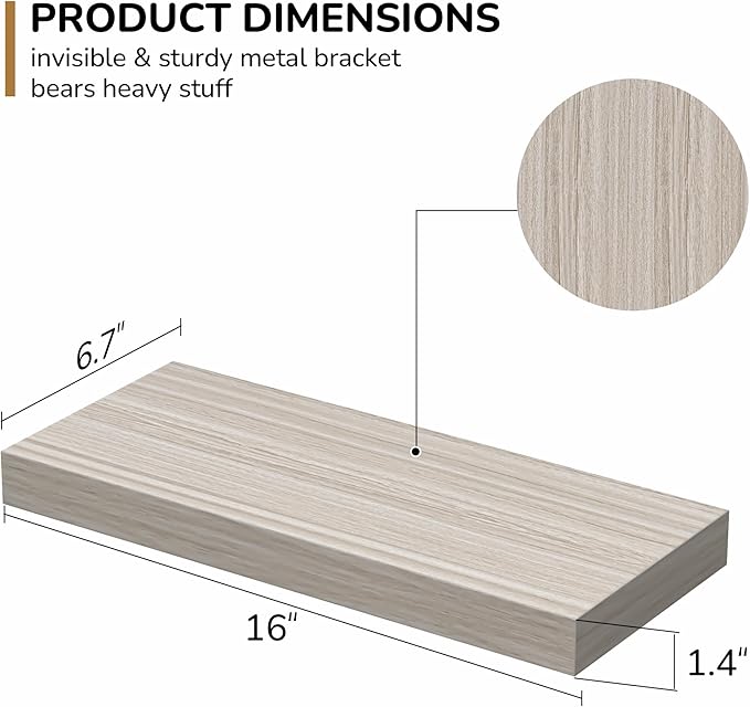- Extra Deeper & Thicker - Each board measures 16"W x 6.7"D x 1.4"H. Extra deeper and thicker design in order to bring maximizes storage space and weight capacity, even hold up to 30 lb each. This floating shelf taking up zero square feet, reduces clutter and highlights dΓ©cor in compact spaces.