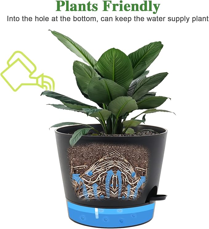 Self Watering Pots for Indoor Plants,12 inch Planters with Drainage Holes Plastic Flower Pots with Deep Reservoir, Black