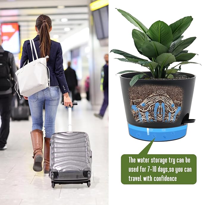 - Self-Watering Planter Allows 15+ Days Watering-Free: This plant pot with deep reservoir can store 60 oz water in the bottom, not only to catch drainage but also to "auto-water" your plants by the wick. Keep your plants watered for 2-3 weeks until the next watering.And Self water regulation allows you no more strugglling with over watering.Go on a vacation with no worries about plants will be dried up.