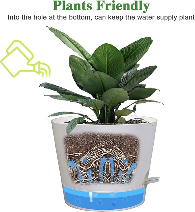 - Self-Watering Planter Allows 15+ Days Watering-Free: This plant pot with deep reservoir can store 60 oz water in the bottom, not only to catch drainage but also to "auto-water" your plants by the wick. Keep your plants watered for 2-3 weeks until the next watering.And Self water regulation allows you no more strugglling with over watering.Go on a vacation with no worries about plants will be dried up.