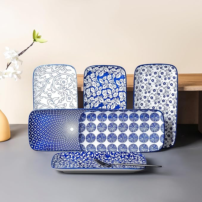 Selamica Ceramic Serving Platters, 12 Inch Serving Trays for Party Entertaining, Large Rectangular Serving Plates for Food, Set of 6, Vintage Blue