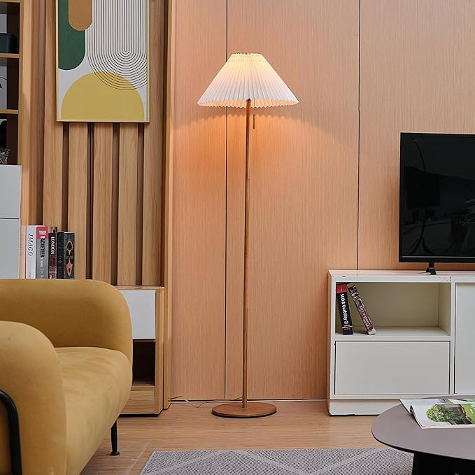 GLOBE Electric 61000053 62" Floor Lamp, Wood-Toned Finish, Pleated Fabric Shade, Pull Chain Switch, Reading Light, E26 Base, Modern Classic Lighting for Living Rooms and Bedrooms