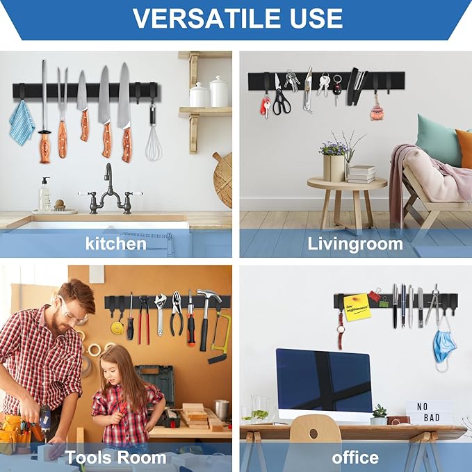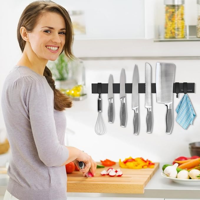 - ORGANIZE KITCHEN: The magnetic knife holder can help you organize your knives. Besides, there are also 3 hooks, hang kitchen utensils and items. Make your kitchen more convenient and tidy