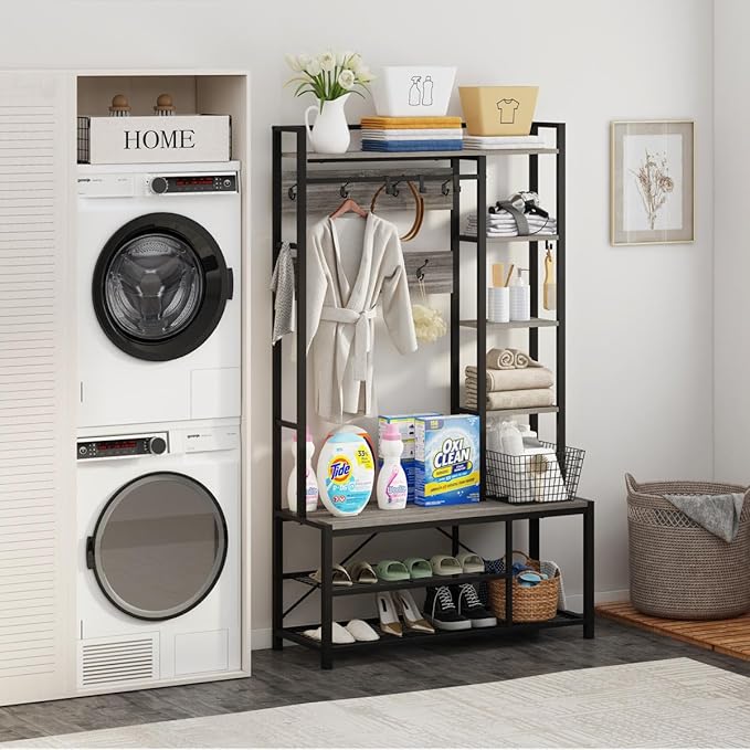 - 【5-in-1 Freestanding Hall Tree】Enhance your entryway with versatile 5-in-1 hall tree. Combining a coat rack, reversible 5 tier shelves, entryway shoe bench, 7 hanging hooks, clothes rail with 5 removable hooks, this hall tree offers both style and functionality. Keep your space impeccably organized with abundant storage for shoes, bags, coats, and more, all while adding a charming touch to your hallway.