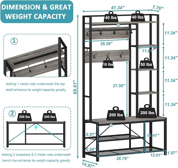 - 【Impressive Weight Capacity and Sturdiness】The bench top of this coat tree is reinforced with two strong support rods and two crossbars, allowing it to effortlessly hold up to 400 lbs. The thoughtful design includes a comfortable seat height for optimal sitting. With meticulous construction, this hall tree with shoe bench ensures exceptional stability, leaving no room for wobbling once fully assembled.