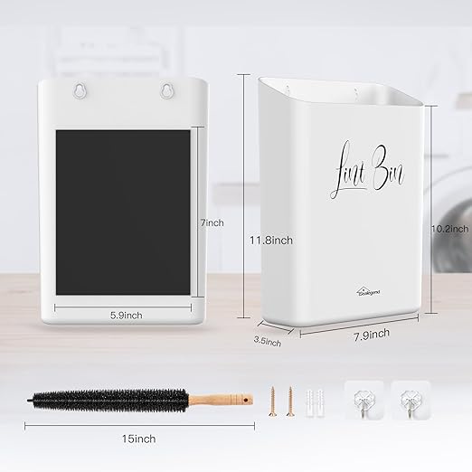 - [SPACE SAVING] Lint bin size: 11.8*3.5*7.9 inches, back panel magnetic strip size: 5.9 x 7 inches, thin and light design is suitable for any small space in your laundry room, very easy to use within reach, also can be changed at will to suit your needs and change the location.