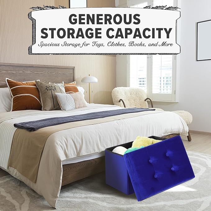 - 【Large Storage Space】 It is made of high quality fiberboard frame, so you can sit on it with confidence. It's perfect for your bedroom or living room. Whether used as a under desk foot rest or as living room storage, this ottoman foot rest provides maximum comfort. The velvet folding footstool serves as a ottoman with storage for living room to store Christmas gifts and blankets, cushions, books and sports equipment. It helps to keep the room organized and neatly hide clutter