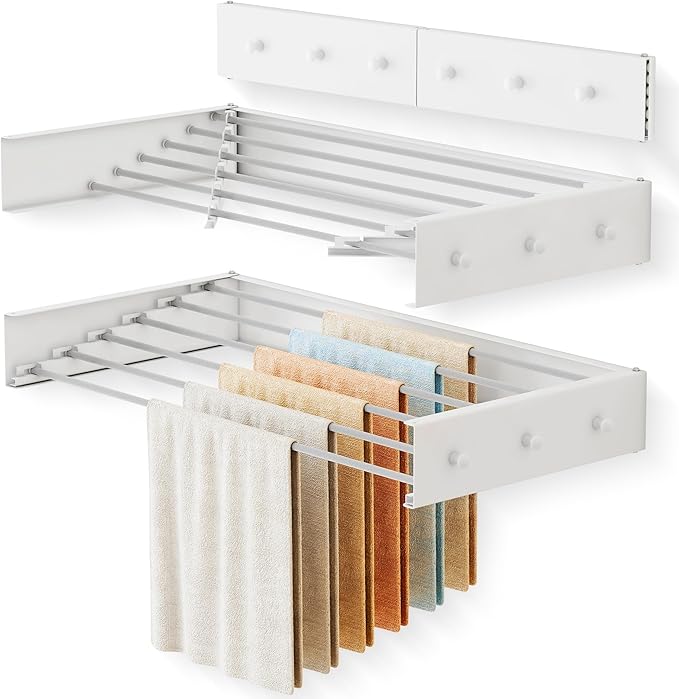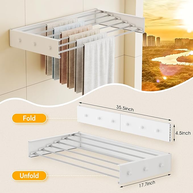 Upgrade Drying Rack Clothing,Clothes Drying Rack Wall Mounted,Laundry Drying Rack Wall Mount,Foldable,Collapsible,Retractable,6 Aluminium Poles,with Hooks,(White 35.5"