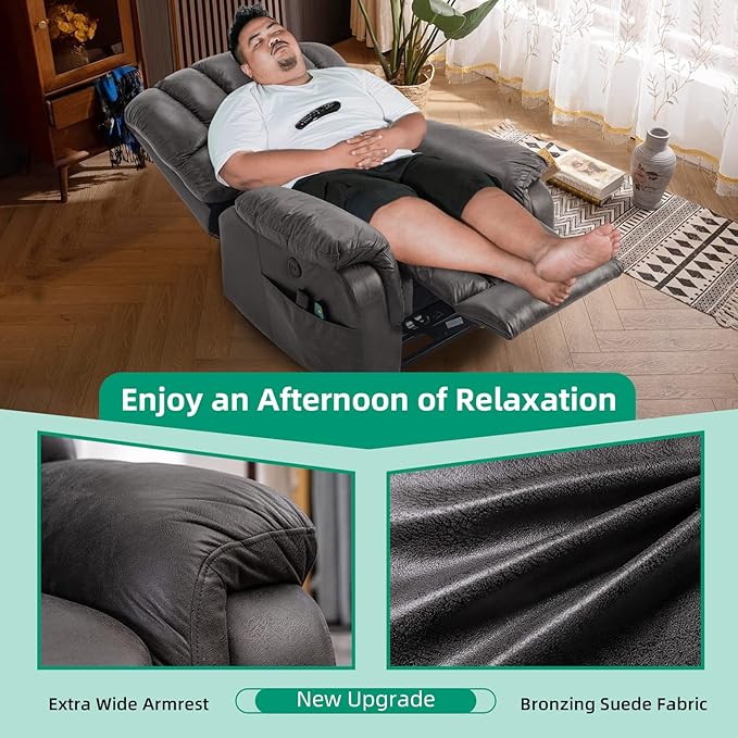 - 【Deeper Seat & Delicate Fabric】- This upgraded power lift chair is equipped with oversized and wider armrest, back and seat, which make it an ideal choice for people in bigger size. Overstuffed upholstery padded with high density sponge brings comfort, once you take a seat, you'll never want to get up. The bronzing suede fabric with a special process to bring a leather-like visual finish on the suede surface, soft to the touch, eco-friendly and breathable, wear-resistant and stain-resistant.