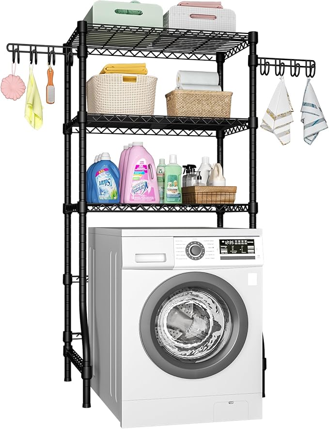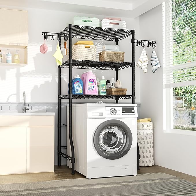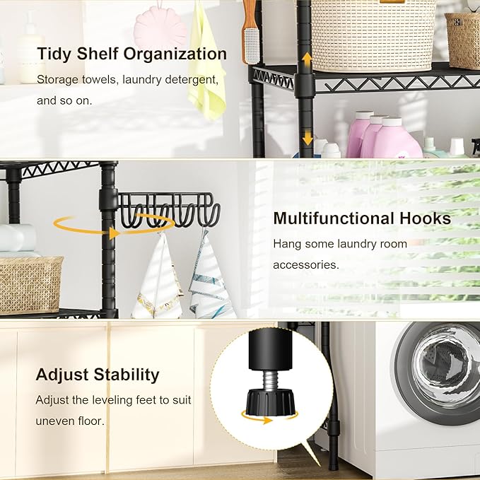 - Space Saver: The adjustable wire shelves for storing and organizing daily laundry room accessories, like towels, washing powder, washing liquid, and laundry beads. It also can be adjusted to any height you want to suit different height washing machines