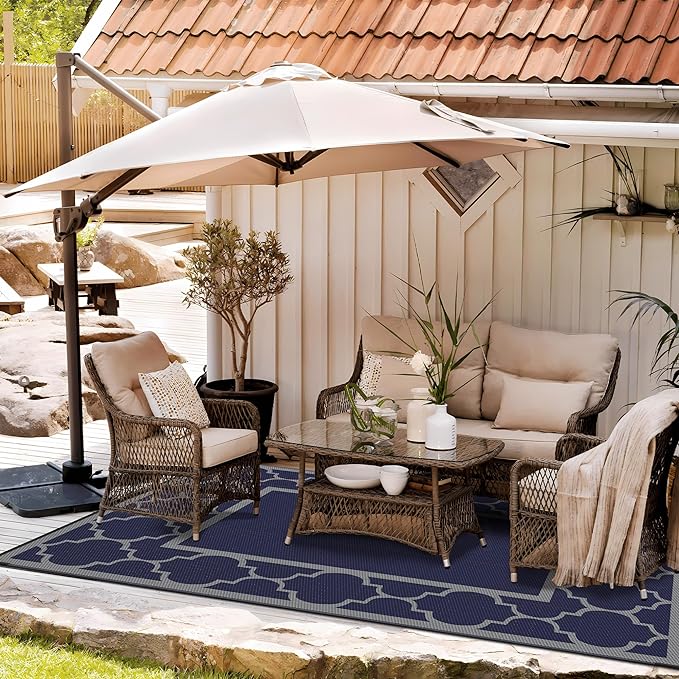 - Mood-Boosting Colors:Choose stain-resistant dark tones or go modern with blue & white or black. The reversible mat, with outdoor carpet qualities, is easy to clean and coordinates seamlessly with various decors. Whether placed on your deck or under a shaded umbrella, it serves as the perfect outdoor patio rug to match the style of your pamapic outdoor furniture.Itβs an excellent piece for fall home decor or to use as a stylish outdoor rug fall accent