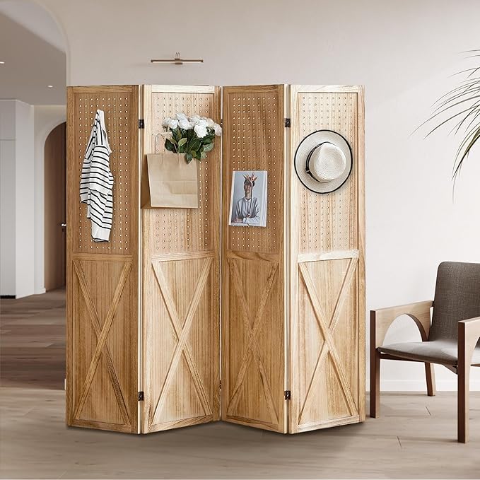 4 Panel Pegboard Wood Room Divider, 5.6Ft Pegboard Display Folding Privacy Screens, Peg Board Display Freestanding for Trade Show Craft Show Home Wall Organizer, Light Brown