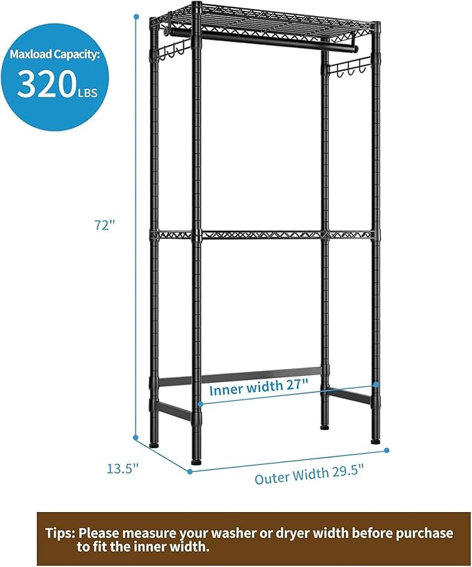 - Space-Saving and Versatile Design: Elevate your laundry organization with our multi-functional storage solution. The overall dimensions of 13.5”D x 29.5”W x 72”H ensure a perfect fit for washers and dryers up to 27" in width. This practical rack includes 2 wire shelves, 1 hanging rod, 2 hooks, adding extra space and organization to your laundry room. The upper crossbar design facilitates easy hanging of clothes, while the hook allows you to hang light clothing, towels, or cleaning supplies(Please note the appropriate size for the washer and dryer and purchase according to the required dimensions)