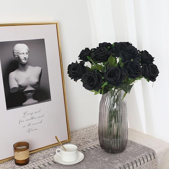 - Premium Quality Fake Roses: Rose flower head made of silk.Metal wire as skeleton,wrapped by plastic,can be cut or bent.Single stem black silk roses have silky( real touch ) flowers and (high realistic) leaves.It's classic design and Multiple color choices can meet your demands in all seasons