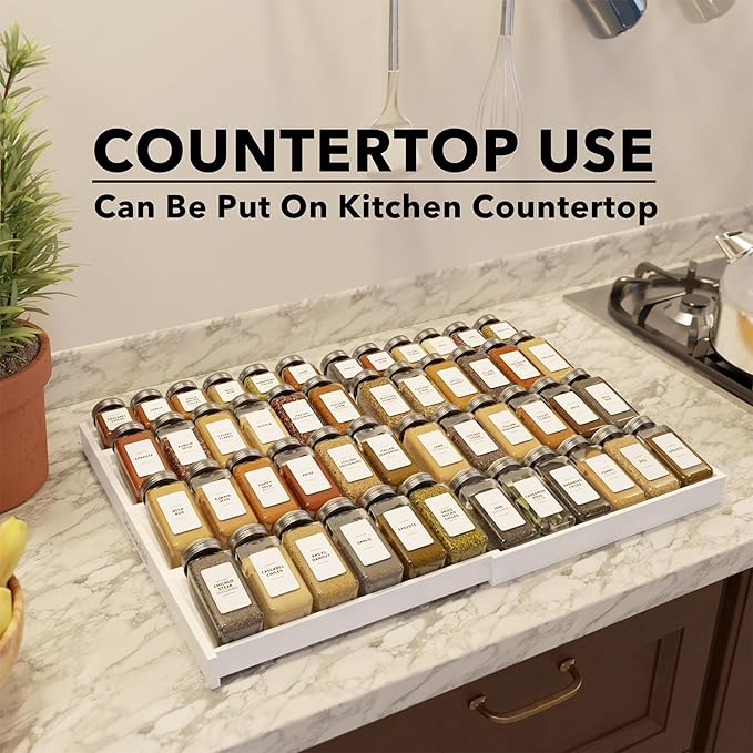 - EXPANDABLE DRAWER INSERT - The wooden spice rack is expandable from 12" to 23" wide, to fit in different sizes drawers