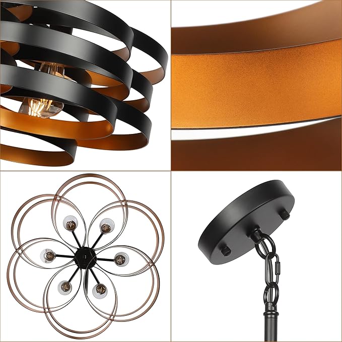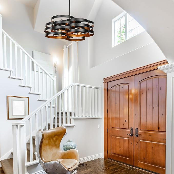 - Rustic Farmhouse Style -- Rustic chandelier was made by a skilled craftsman. The light body is composed of 18 rings black with gold interior decoration, arranged in 6 tiers to create a very unique look. The stacked rings will cast beautiful light and shadow under the irradiation of the light. The black chandelier contains 6 bulb bases that will emit a lot of light and illuminate the entire space.
