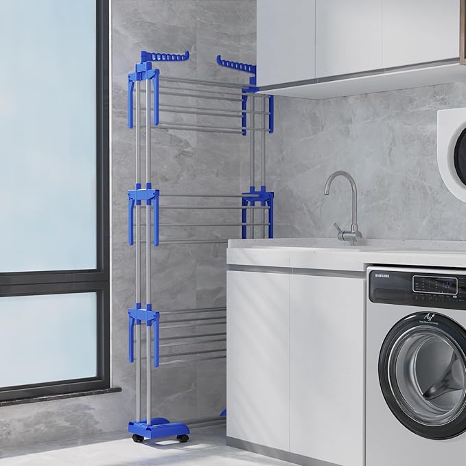 Bigzzia Clothes Drying Rack, 67.7 Inch Laundry Drying Rack with Foldable Base, 4 Tier Stainless Steel Drying Rack Clothing, Movable Laundry Rack for Indoor Outdoor-Blue