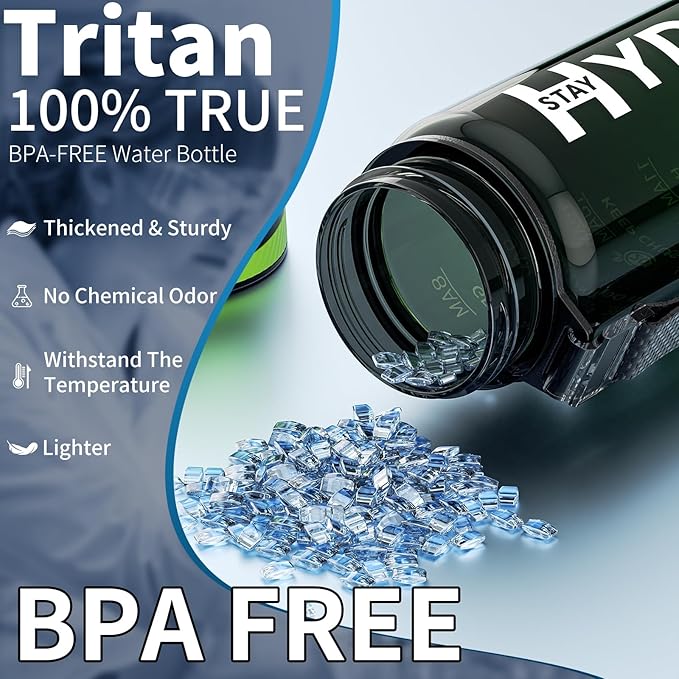 - Tritan & BPA Free: Tritan is a new copolyester material with excellent heat, impact and chemical resistance. Mevoly reusable water bottle is made of Tritan, the safest and most durable bottle plastic. This plastic water bottle will not produce odors, chemicals or bad tastes