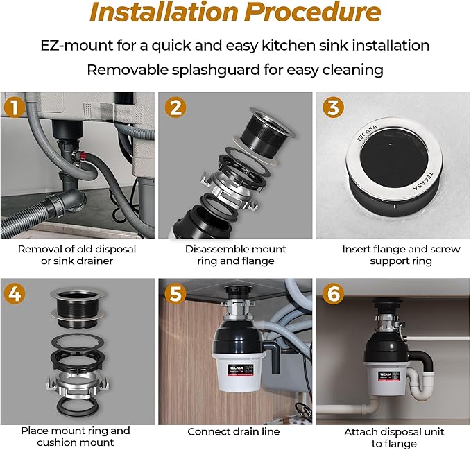 - ππππππ ππππππππππππ: The sink disposal features an exquisite exterior design that fits most existing EZ mounting assemblies, making it easy and fast to install or replace. It's compatible with other popular brands. TECASA garbage disposal is suitable for most home kitchens for standard 3-1/2 inch sink opening hole. A pre-installed 39" power cord for electricity connection.