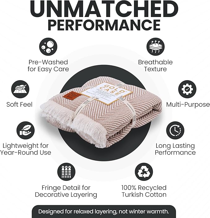 Gold Case Throw Blanket for Couch – 100% Recycled Turkish Cotton Blankets & Throws – Elegant Decorative Throw Blankets for Living Room Sofa – Woven Throws for Couch – Elegant Beige – 50x60