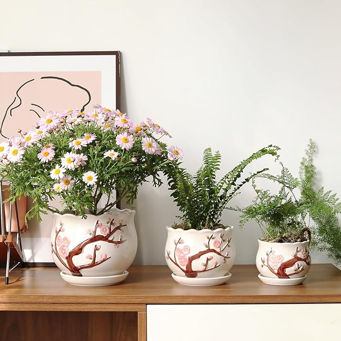 - PLANT POTS SET OF 3 : Made of high-quality ceramic materials, The surface is decorated with hand-painted flowers, suitable for pairing with various interior decoration styles, adding greenery to your home.