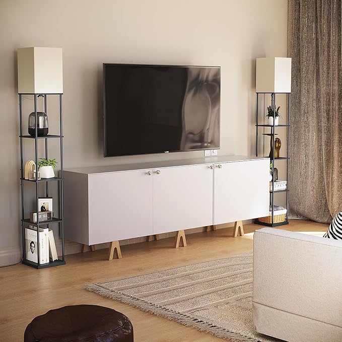 - Non-glaring Cloth Lampshade: This shelf floor lamp is equipped with a high-quality off-white cloth lampshade and opens upwards. With the built-in three-color temperature bulb, it can be used for both functional lighting and ambient lighting.