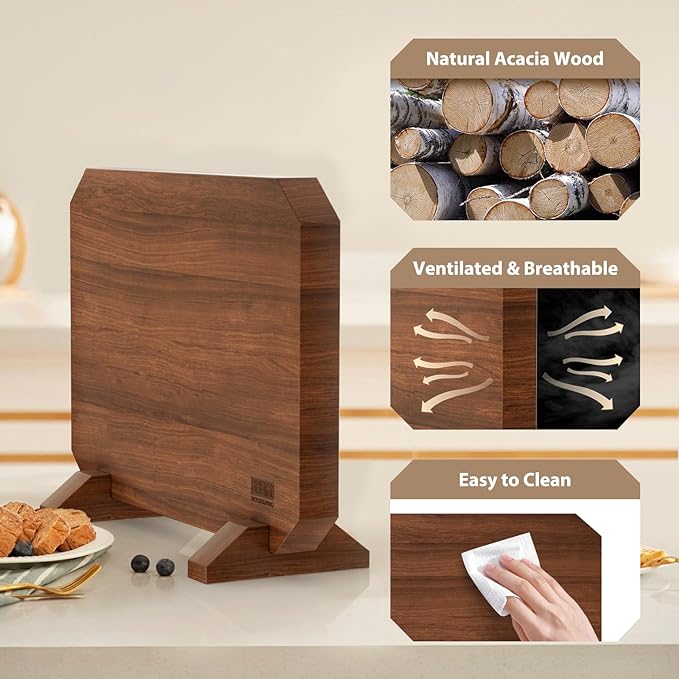 - 【Made of Acacia Solid Wood】A good knife block comes from good wood, made from acacia wood that grows naturally, which has a fine, strong texture and natural wood grain that complements any kitchen environment. The wood also reduces unnecessary friction with knives and prevents them from dulling.