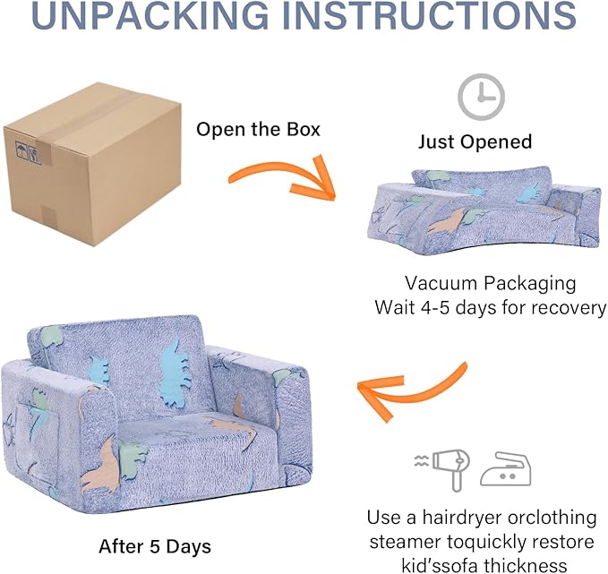 - Tips: When receiving the children's sofa, it may be wrinkled due to extrusion during transportation, and it needs to be gently patted until fluffy, and then wait for 4-5 days to naturally restore its original shape, or it can be quickly restored to its thickness with hot air blowing by clothing steam engine or hair dryer to remove wrinkles.