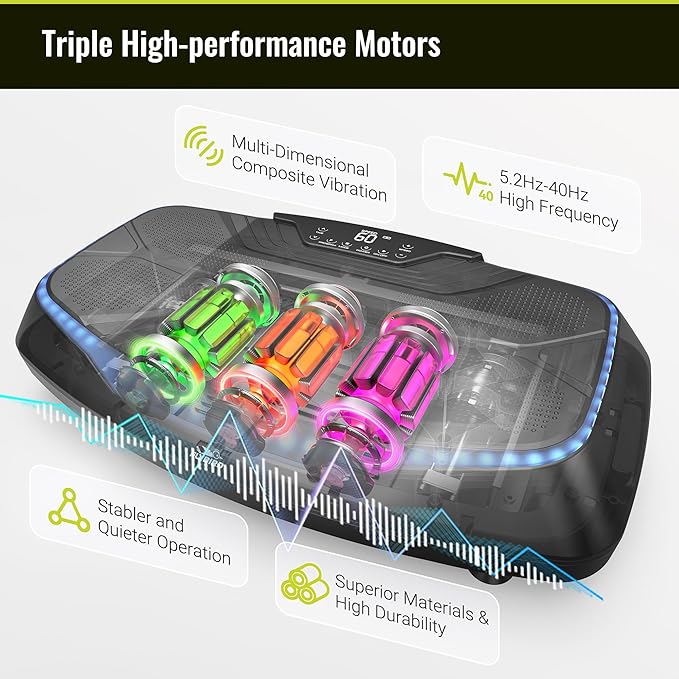 - Triple High-performance Motors: FLYBIRD multi-dimensional composite vibration plate is composed of triple motors, with a vibration frequency range of 5.2Hz-40Hz, which is more stable and quiet; Superior materials enhance the durability of the machine