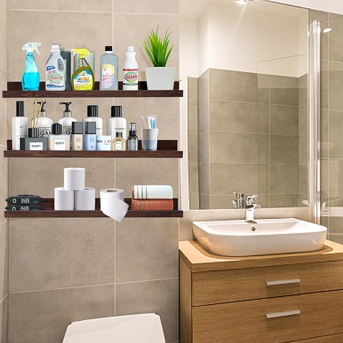 - [Multifunctional Storage Shelves]:This set of wall photo shelf for storage has multiple uses. Whether you are placing photo frames and paintings in the living room or hallway to add room decoration, placing toiletries such as shampoo, conditioner, essential oils and other items in the bathroom, or organizing spices and seasoning bottles in the kitchen, these wall-mounted floating shelves can meet your imagination and needs.