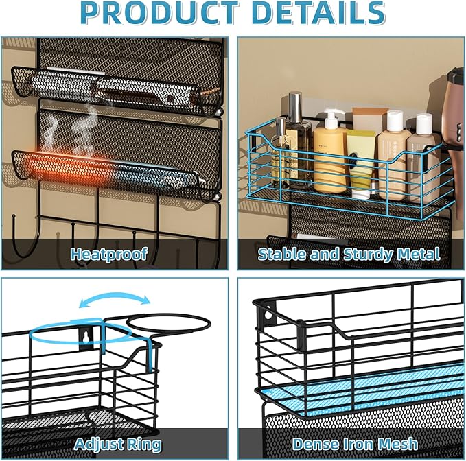 - 【1 Basket/3 tier Shelf】The hair tool organizer includes 1 metal basket, 2 mesh holders, 1 hairdryer holder, and 1-row hook. Separate all your hair tools, such as curling iron, blow dryer, straightener, etc.