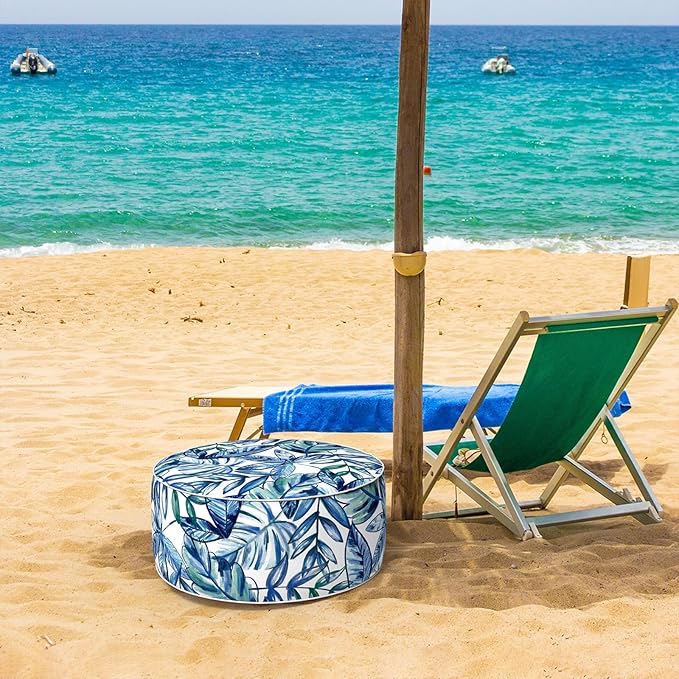 Inflatable Ottoman Stool D21 xH9 for Outdoor/Indoor Use, Water Repellent Patio Foot Rest Stool with Portable Handle,Round Pouf Ottoman Suitable for Garden,Deck and Camping - Leaves Ink Blue