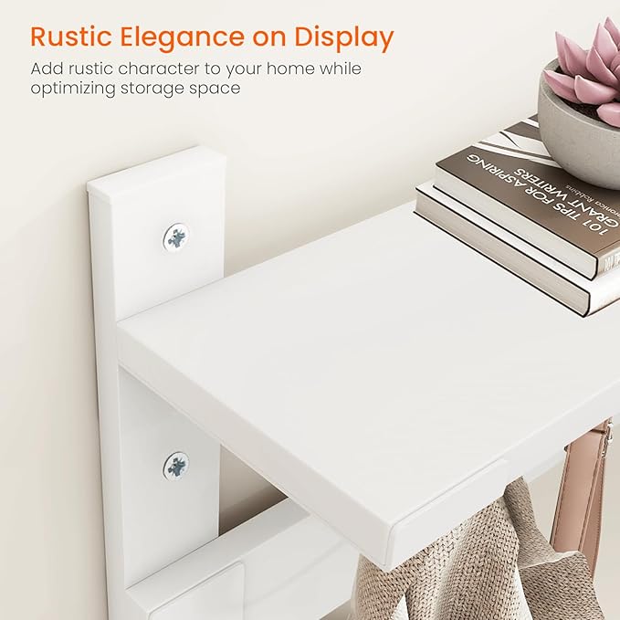 - AMPLE 29-INCH STORAGE: This 2-in-1 entryway shelf with hooks offers a blend of hanging and display functionalities. This wall shelf with hooks is ideal for showcasing photos, plants, and other decor, making it a perfect addition to entryways, bathroom, or bedrooms