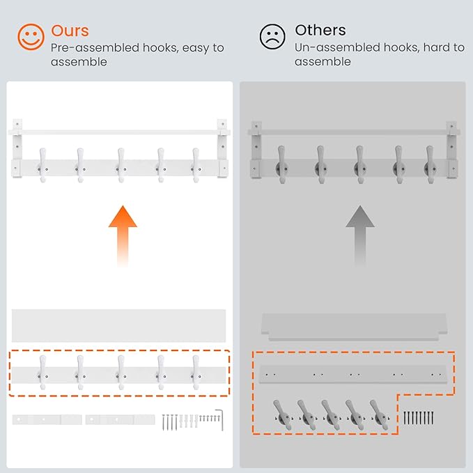 - EASY INSTALLATION: Comes with all necessary hardware, 5 coat hooks assembled on rail before package, pre- drilled holes for mounting brackets, making setup hassle-free for quick and secure mounting on your wall