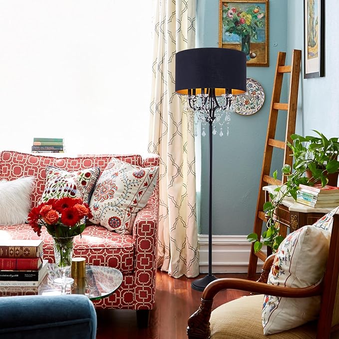 Wellmet Black Crystal Drum Shade Floor Lamp, 6 Light Black Gold Shade, Candle Base, for Living Room, Bedroom, Reading Room, Hallway, Corridor