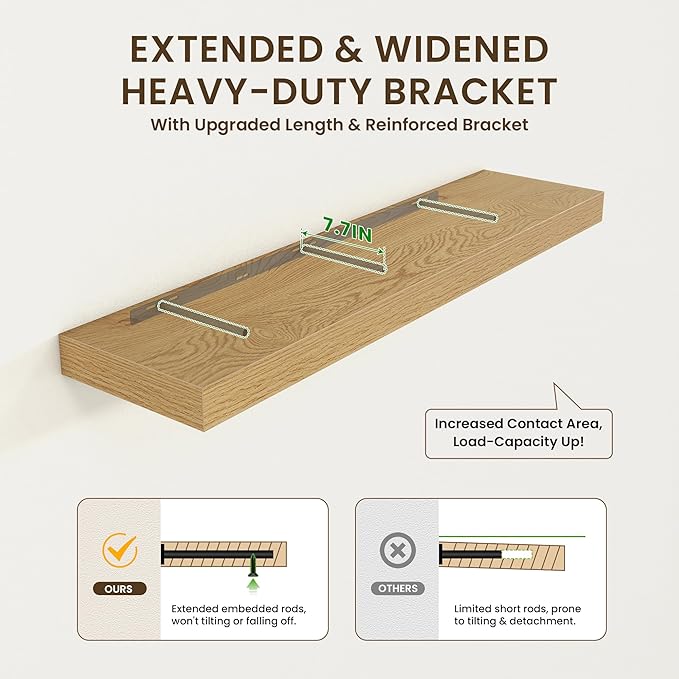 - DEEPER & THICKER SHELF- Our floating shelves measure 72W x 11.6D x 2H, deeper and thicker than usual wall shelves, which create more storage and display space for your home