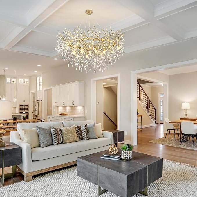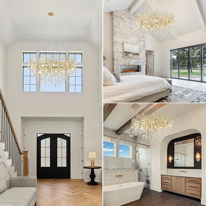 - Application Space:This round crystal chandelier is perfect for living rooms, entryways, high-ceiling spaces, and stairwells. Its size is ideal for installation in open-concept spaces.Crystal chandelier resembles a golden tree, lighting up and warming the entire house while also serving as a stunning decorative piece. The chandelier's ceiling canopy is compatible with both flat and sloped ceilings, making it perfect for the dining room, living room,bedroom, or any other space.