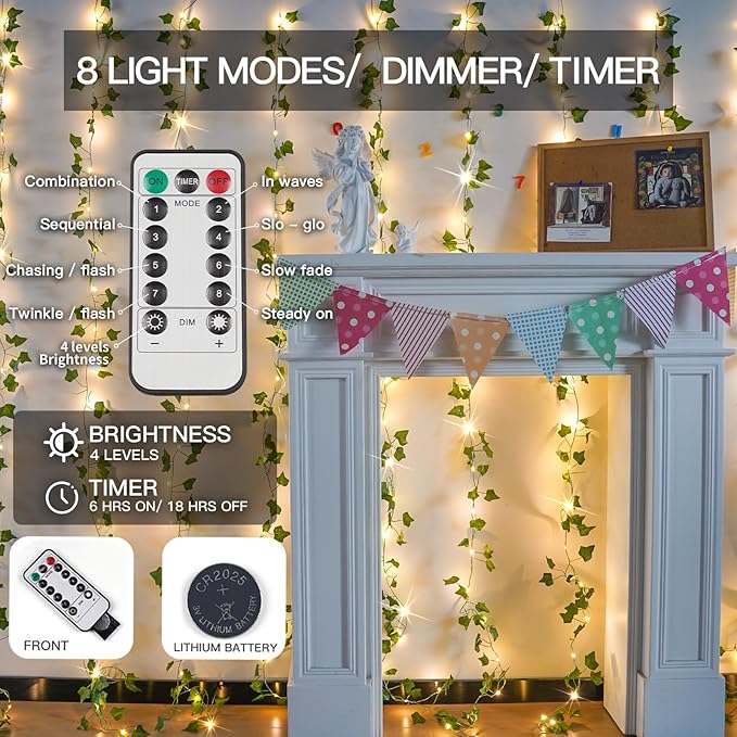 - [REMOTE CONTROL/8 LIGHTING MODES] The 8-button remote control enables easy mode selection, while the automatic memory function stores your preferred settings. With both steady and 7 flashing modes, as well as a built-in timer that keeps the lights on for 6 hours and off for 18, controlling ivy vines with fairy lights is effortless. Press the timer button of the remote control to blink once to start the timer, press twice to blink twice to turn off the timer.