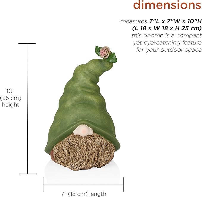 - CHARMING GNOME DECOR: Add a whimsical touch to your garden, patio, or lawn with this adorable gnome head statue. Featuring a green hat and sculpted rope beard, it’s the perfect accent for flower beds, garden paths, or under bird feeders.