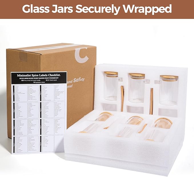 - Comprehensive Package: You'll receive a set of 12 spice jars with bamboo lids and spoons, each boasting a capacity of 8 fl.oz and measuring 4 x 2.5 inches. But that's not all – we've also included oil and water-proof labels, along with 184 pre-printed spice label stickers, 16 writable pantry labels, and 75 expiry date labels.