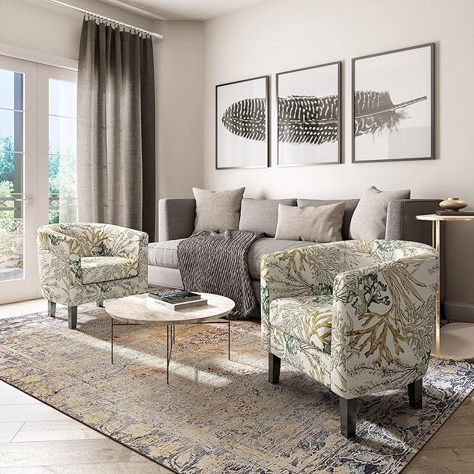 BELLEZE Living Room Chairs Set of 2, Linen Round Accent Barrel Chairs, Club Tub Sofa Chairs for Bedroom, Corner Chairs with Flared Legs and Cozy Soft Padding - Highland (Green Coral)