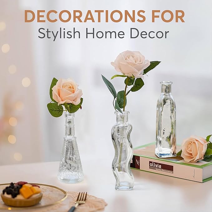 - Vintage Vases for Timeless Elegance – Our 14-piece clear vases for centerpieces offer a variety of unique antique-inspired designs, and shapes to create a warm and inviting atmosphere. From slender amphora styles to wide robust designs, there's a bottle to suit every decor and project.