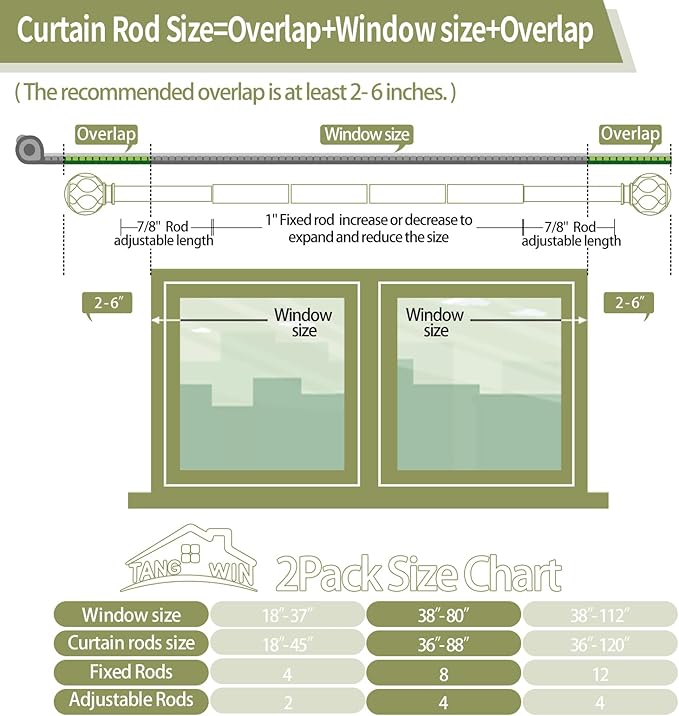 - 2 Pack Curtain Rods for Windows 48 to 84 inch(4-7ft): TANGWIN drapery rods include 8 x 16" x 1" fixed rods, 4 x 16" x 7/8" adjustable rods, 4 x finial, 6 x bracket, 6 x connector, 12 x anchor, 12 x screw. 2 Pack wood curtain rods for windows can extend from 36 to 88 inches, choose the right size curtain rods according to the length of your window.