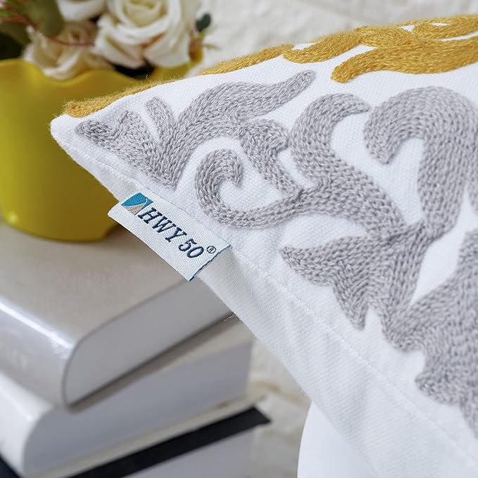 HWY 50 Mustard Yellow Decorative Throw Pillow Covers 18x18 Inch, Pack of 2 Embroidered Cotton Farmhouse Cushion Cover Pillow Case for Sofa Couch Living Room Bed Bedroon, Accent Geometric