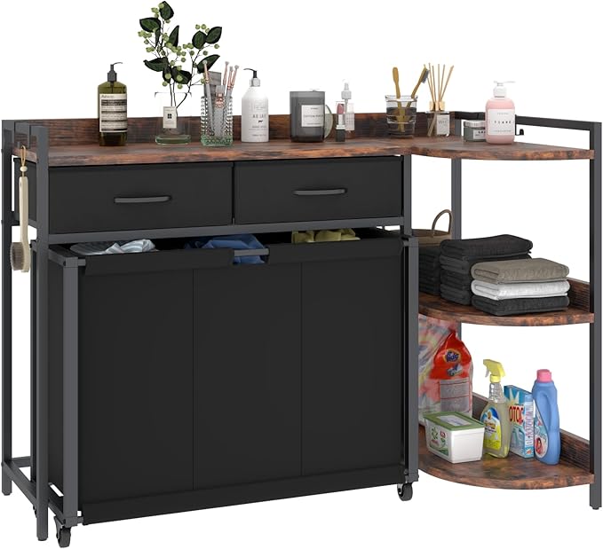 - [Easy Assemble & Reliable Construction] The entire laundry hamper consist of two pieces which are respectively console table with drawers and rolling laundry bags. Both of them utilized powder-coated steel tube as structure, especially the laundry basket choose round tube to reduce wear and tear on fabric. The package comes with clear assembly instructions and numbered parts, you will get a rolling laundry hamper in 30 Minutes.