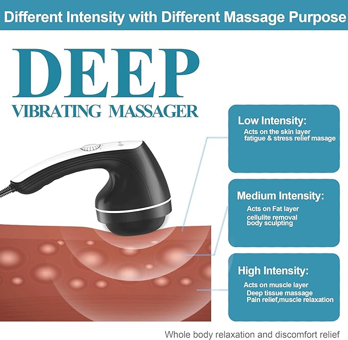 - ☑️【Multi-functional】:This handheld electric massager serves as both a body massager and a lymphatic drainage massager, doubling as a body sculpting machine. you can tailor your massage experience. Opt for low intensity to relax muscles, tighten skin, reduce stomach stretch marks, and relieve stress. Choose medium intensity for fat burning and body sculpting, and high intensity for deep tissue massage.