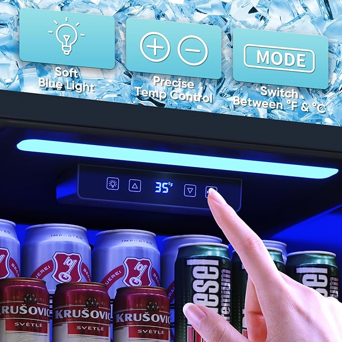 - [Simple & Intelligent Control System] Our Beverage Refrigerator features a user-friendly touch panel that allows for easy temperature adjustment. With a temperature range of 35-65Β°F (2-18Β°C), you can easily customize the temperature to your liking (55Β°F is often cited as close to perfect). To accommodate your usage preferences, we have also added a MODE button. This allows you to toggle between Fahrenheit and Celsius temperatures.There's also an LED light that comes on at the touch of a button.