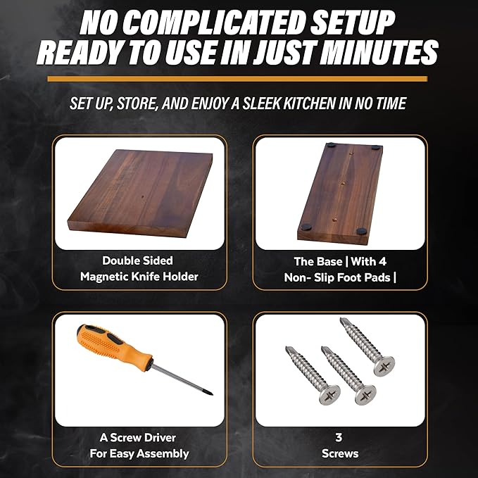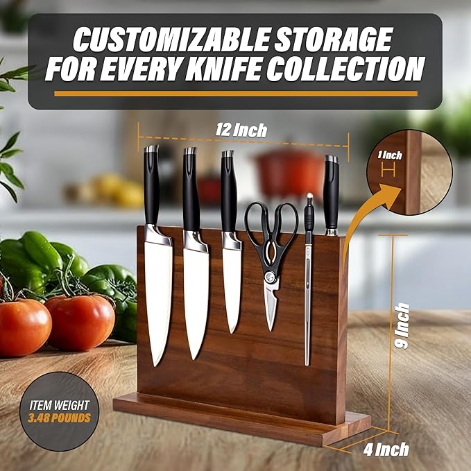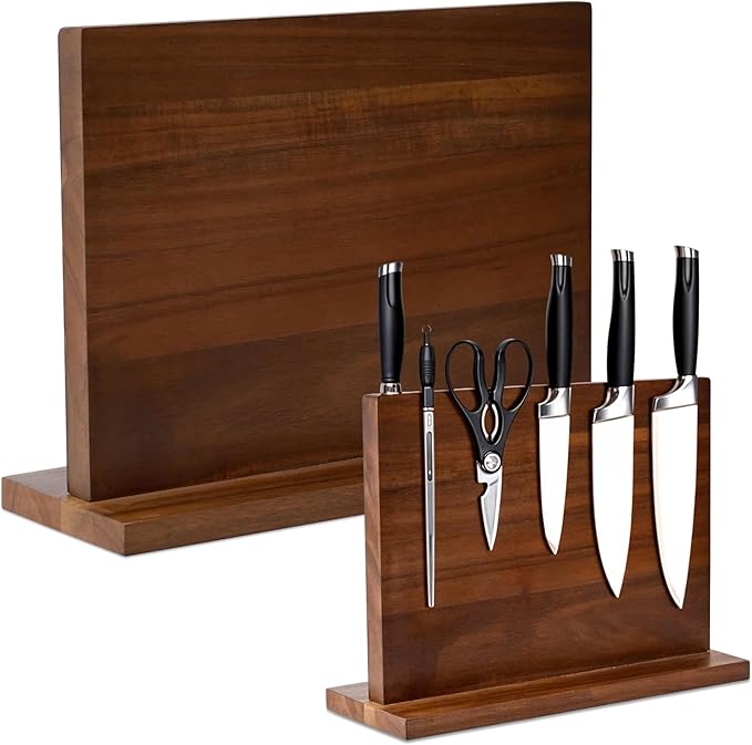 - Powerful Magnetic Grip - Designed with strong double-sided magnets, this wooden knife block securely holds your knives in place. Versatile in use, it serves as a steak knife block, magnetic knife stand, or knife organizer, accommodating any metal kitchen tool or accessory.