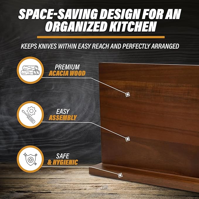 - Sleek and sturdy - Elevate your kitchen’s style and functionality with this expertly crafted knife block, made from premium acacia wood. Featuring a modern design that seamlessly complements neutral kitchen decor, it adds a sophisticated touch to your countertop. More than just a stylish accessory, this knife block provides a durable and reliable storage solution, keeping your knives securely organized and within easy reach for years to come.